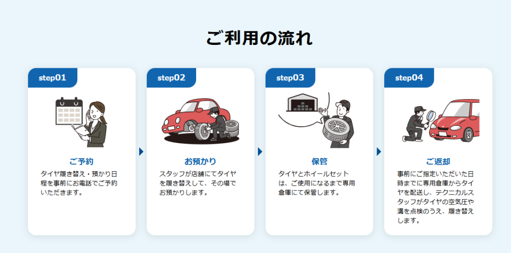 タイヤ・ホイールセットお預かりサービスは、タイヤの保管から履き替えまでワンストップで対応している忙しい方にピッタリのサービスです。